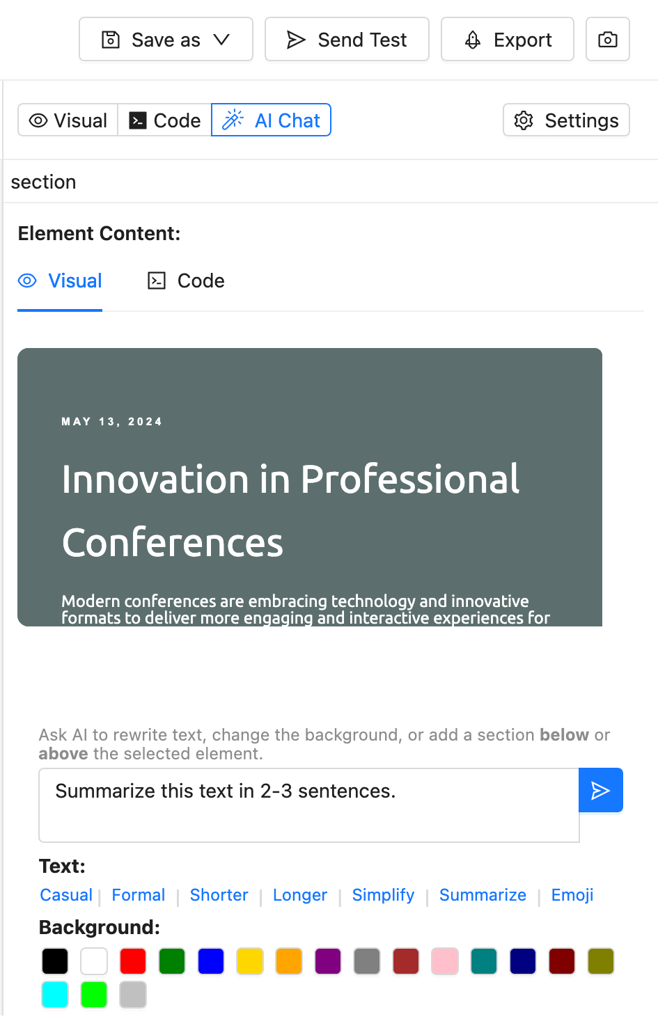 Rewrite text, change tone, generate subject lines, and create images — all powered by AI, right inside the editor.AI Chat Assistant